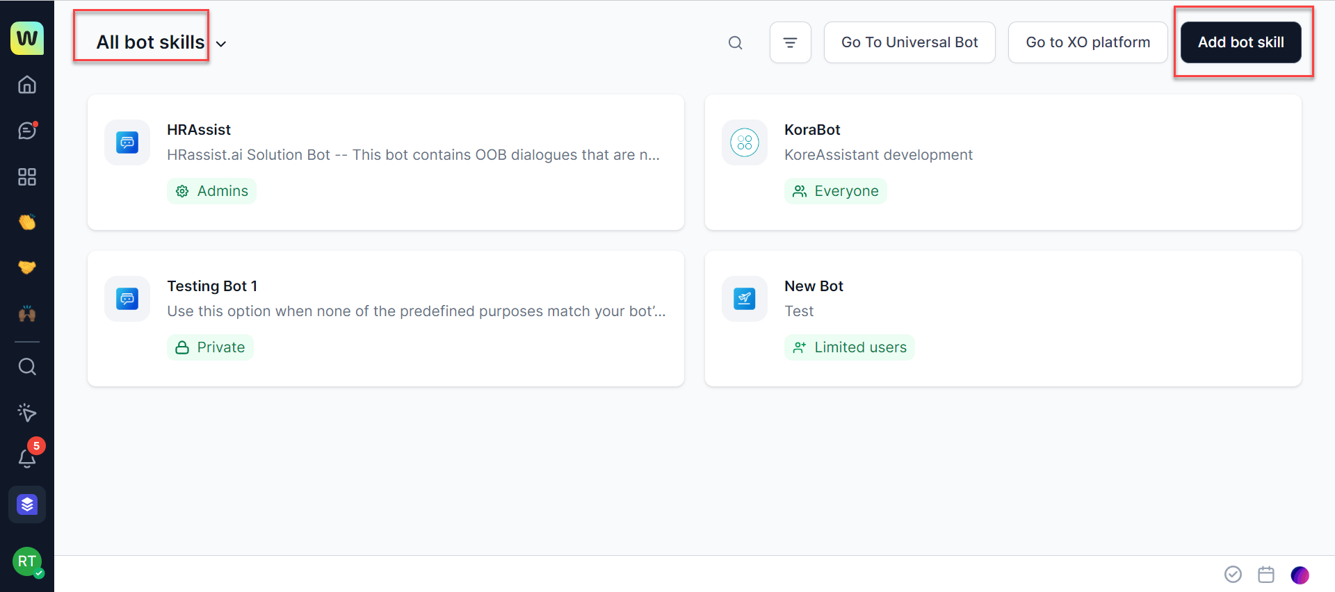 -  Click the Bot skills icon on the left navigation bar of the Workspace.ai application. The All bot skills page is displayed with the list of all the bot skills that are created by the admin.