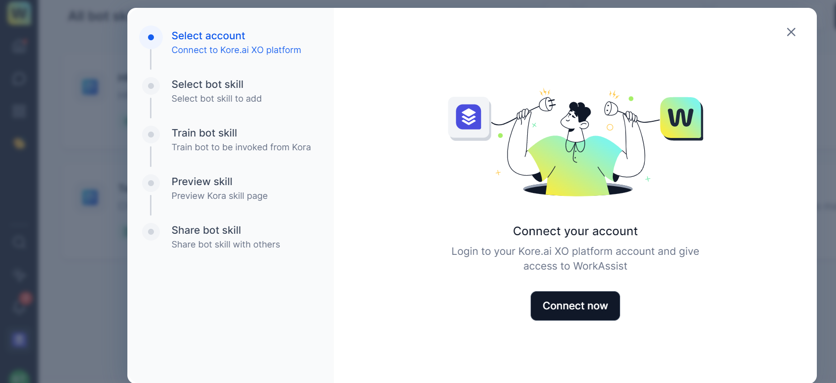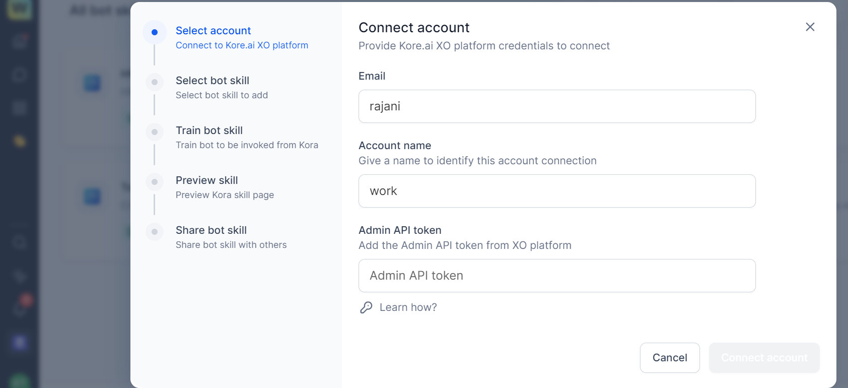 - Click Add bot skill on the header of the All bot skills page. You can now connect to your Kore.ai platform account to proceed further.