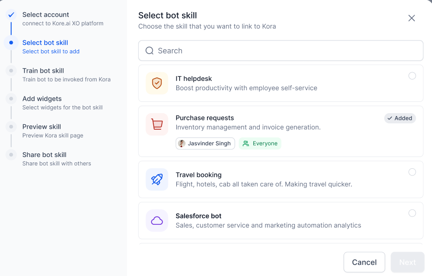 Note: When you hover over the bot skill the contact details of the administrator are displayed. You can contact the administrator to provide access to you if the administrator of the Kore.ai platform has restricted access and has not shared the bot with everyone. - Click Next to save and move to the next step.