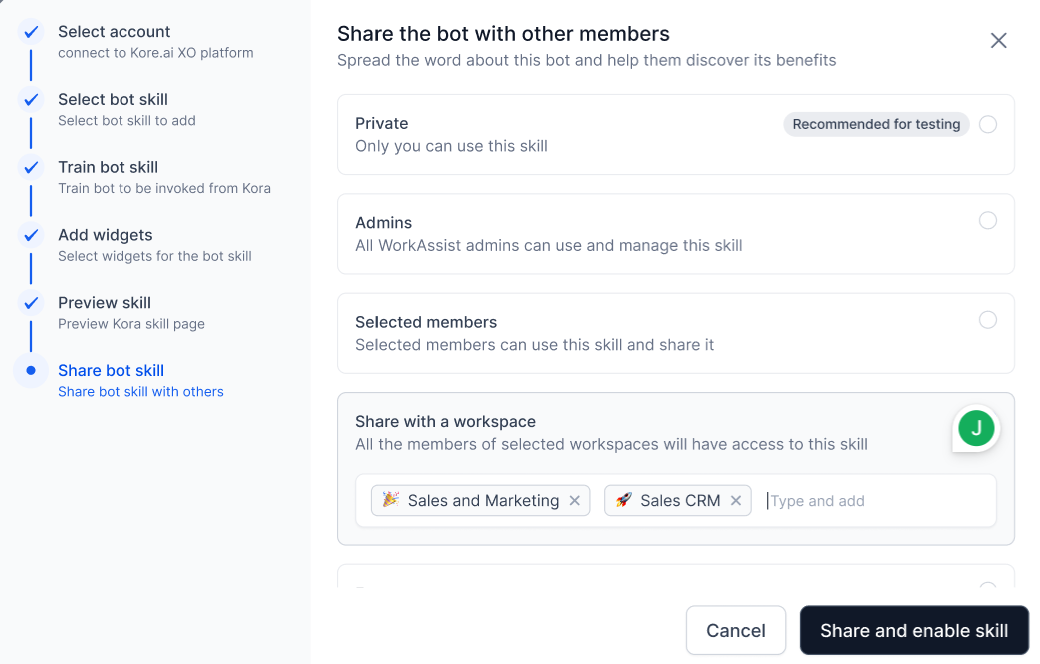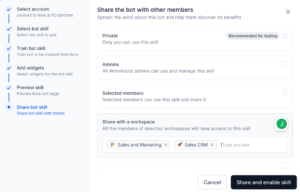 - Select the members with whom you want to add this bot skill. You can keep it Private, All Workspace.ai admins, Selected members, or Share with a members of a workspace, or everyone in the account can use this skill. Click Share and enable skill to enable the skill so that the users with whom this skill is shared can view and access the skill from Kora.