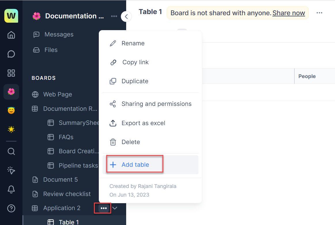 Note: For more information on the table and to view the different actions you can perform on a table, see Table Overview.