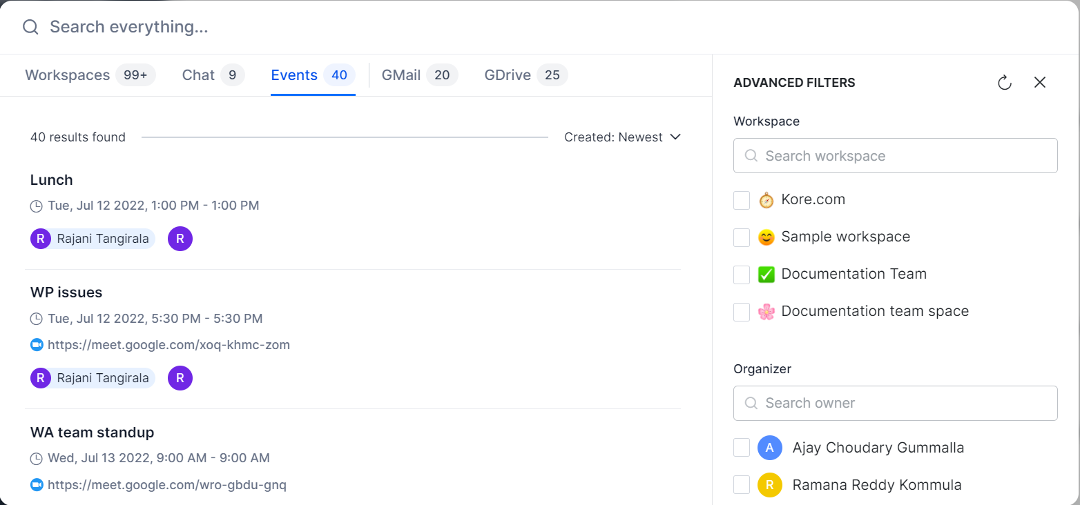 You can apply filters to your search requests to avoid getting unnecessary information. The Advanced filter options are changed based on the information you are searching for. The options change according to the tabs you are on. For example, if you are on the Workspace tab, then the filter options include workspace, board types, created date range, and workspace owner. Whereas, for the Events tab, the filter options include Workspace, Organizers, Date, and Others.