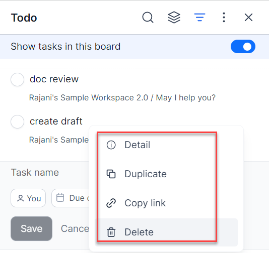 In the To-do list, you can perform other tasks such as renaming it, showing tasks in this board, copying the link, duplicating the task, and so on.