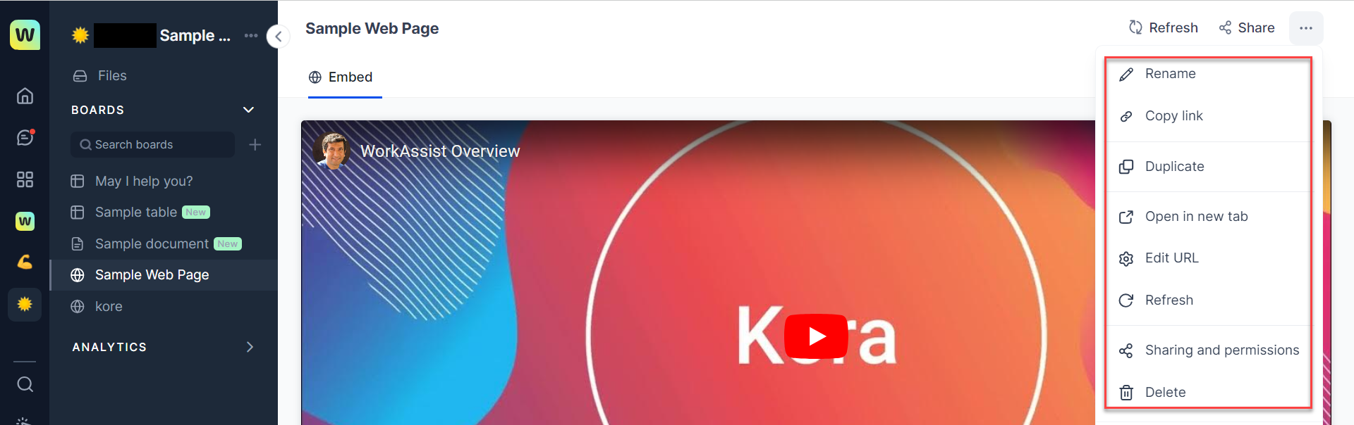 In the embedded webpage, you can perform other tasks such as deleting the embedded webpage, renaming it, sharing your webpage with other users, and so on.